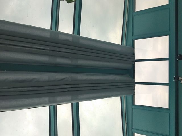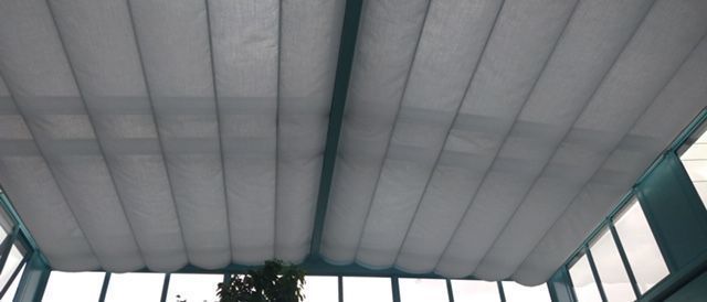 Fabrication de 2 skydômes motorisés pour se protéger de la chaleur sous une double verrière de toit. Protection à la fois du soleil et de la chaleur assurée par cette installation grâce à un tissu à dos aluminisé, sans toucher à la structure de cette très belle pièce.